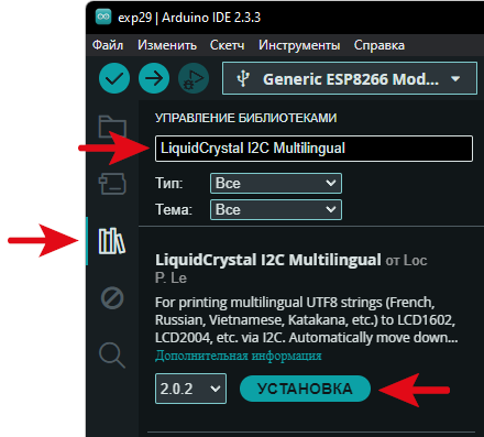 В поле поиска введи название нужной библиотеки, в нашем случае «LiquidCrystal I2C Multilingual», ниже должно появиться название библиотеки, имя автора и номер версии. Нажми кнопку «Установить» и дождись установки библиотеки.