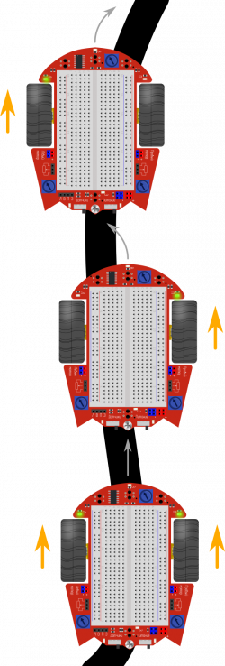 Алгоритм движения робота достаточно прост. Мы ставим робота так, чтобы черная линия была по середине под ним. Левый и правый датчики находились над белой поверхностью. Когда оба датчика находятся над белой поверхностью робот движется вперед. Когда один из сенсоров заезжает на черную линию, соответствующий электромотор останавливается и робот поворачивается, выравнивая свое положение. После того как оба датчика снова находятся над белым полем, робот продолжает свое движение вперед.